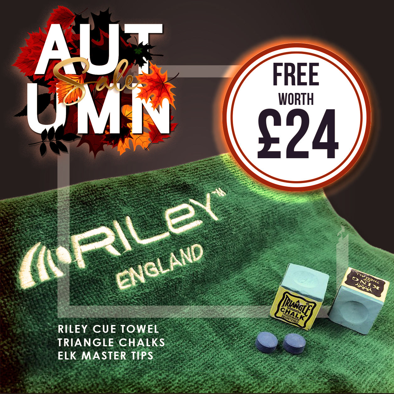 Free accessory pack including ROS Elk tips (as used by Ronnie O'Sullivan); triangle chalk and Riley cue towel.