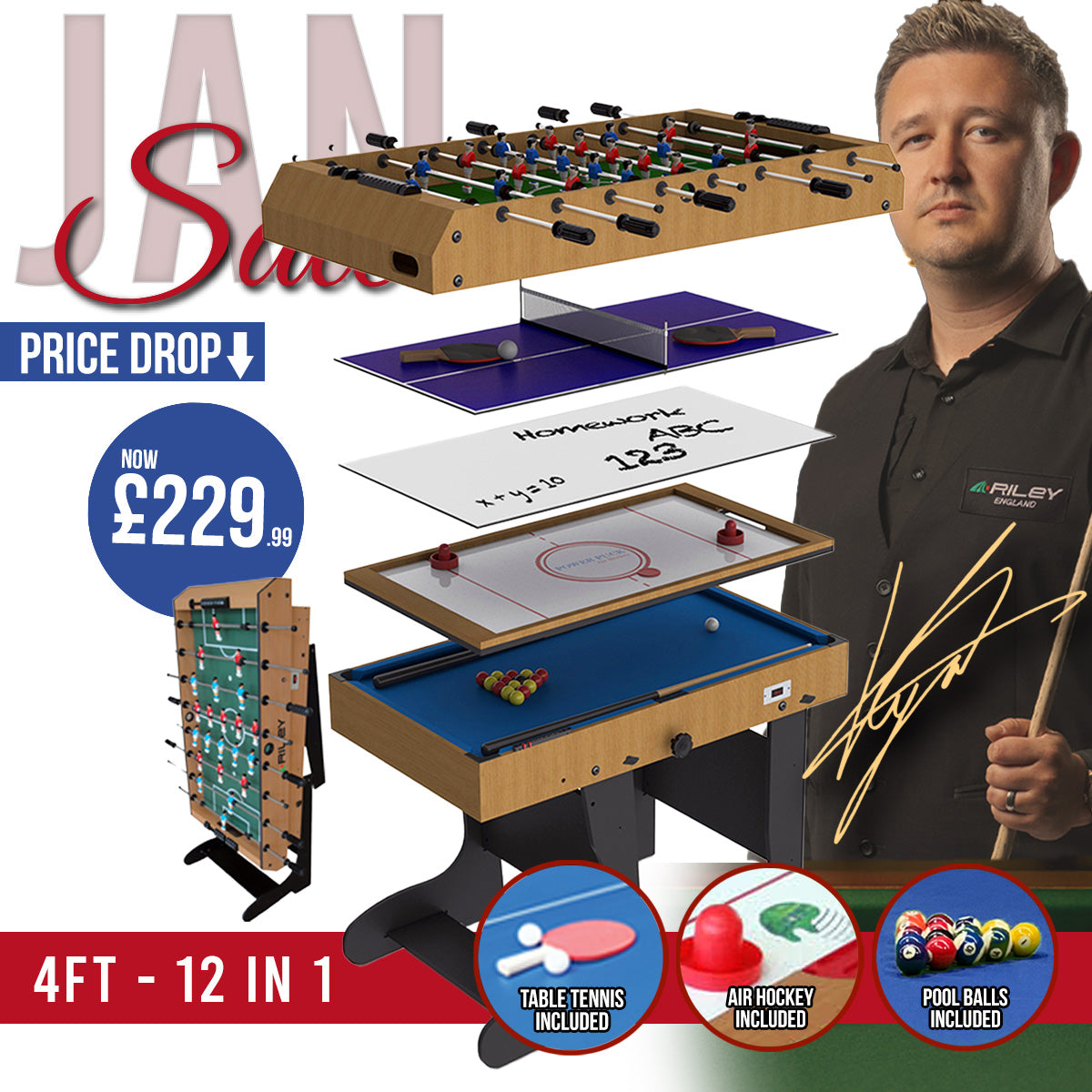 The ever popular Riley Multi Games Table now in a folding leg version! 12 games in 1!! Still the quality construction you expect from Riley, but so easy to store away when not in use. It also comes with a whiteboard and 11 fun games for all the family. Not only do you get real air hockey with an electric fan (not push hockey), but the additional games now mean that the fun just never ends.