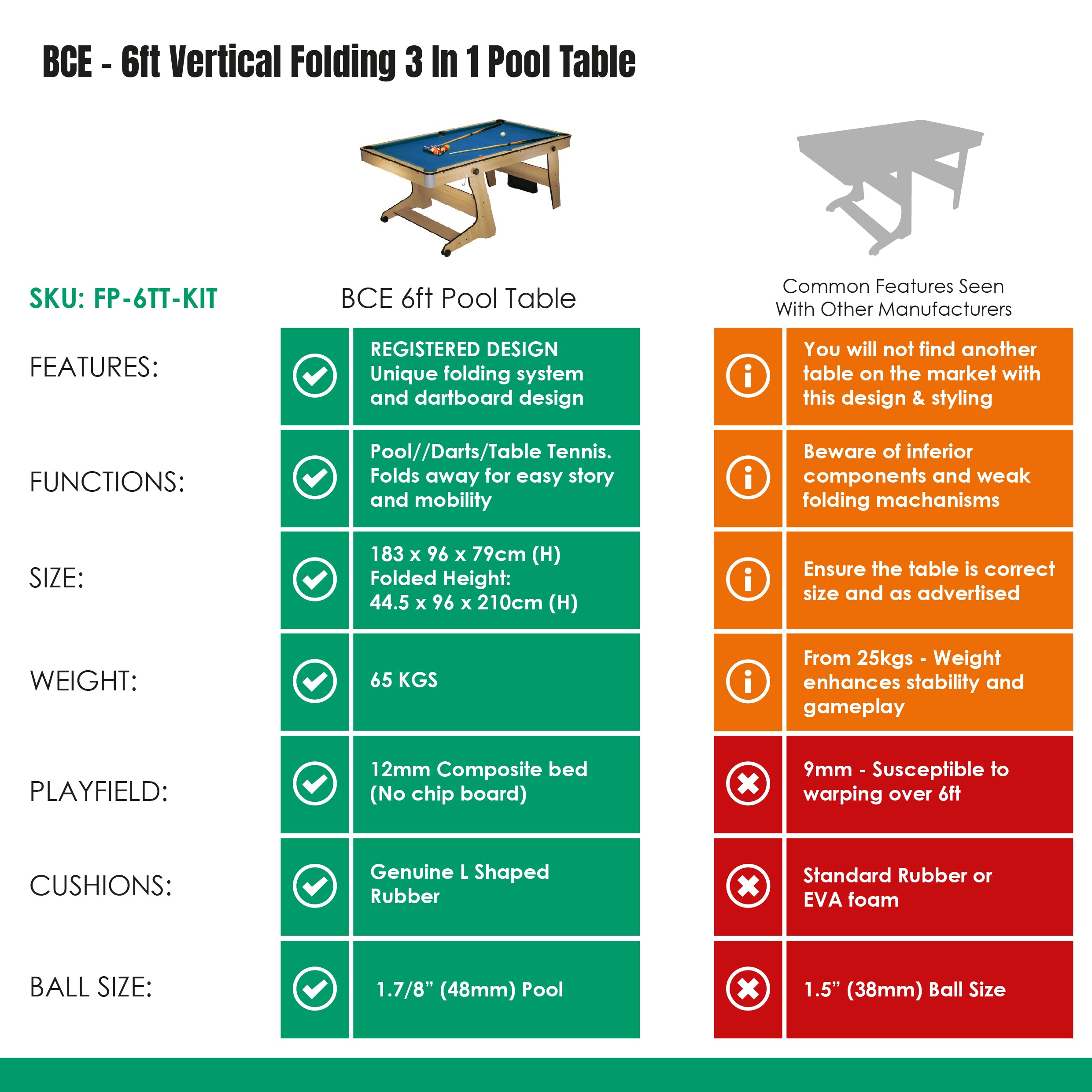 The original and still the best. The BCE 6’ Pool table was the first of its kind on the market. This table combines solid, quality construction with the innovative BCE designed folding leg system. Some have tried to imitate, but no-one has equalled.