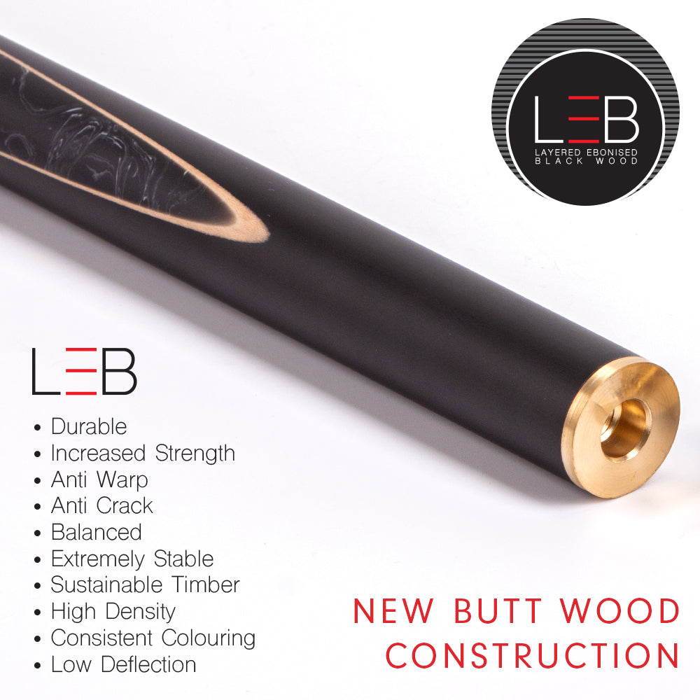 LAYERED EBONISED BLACK WOOD: A modern, high density and sustainable butt wood material advancement. Providing a durable and more consistent performance, whilst maintaining the traditional techniques and aesthetic qualities expected of a top level Pool and Snooker Cue.