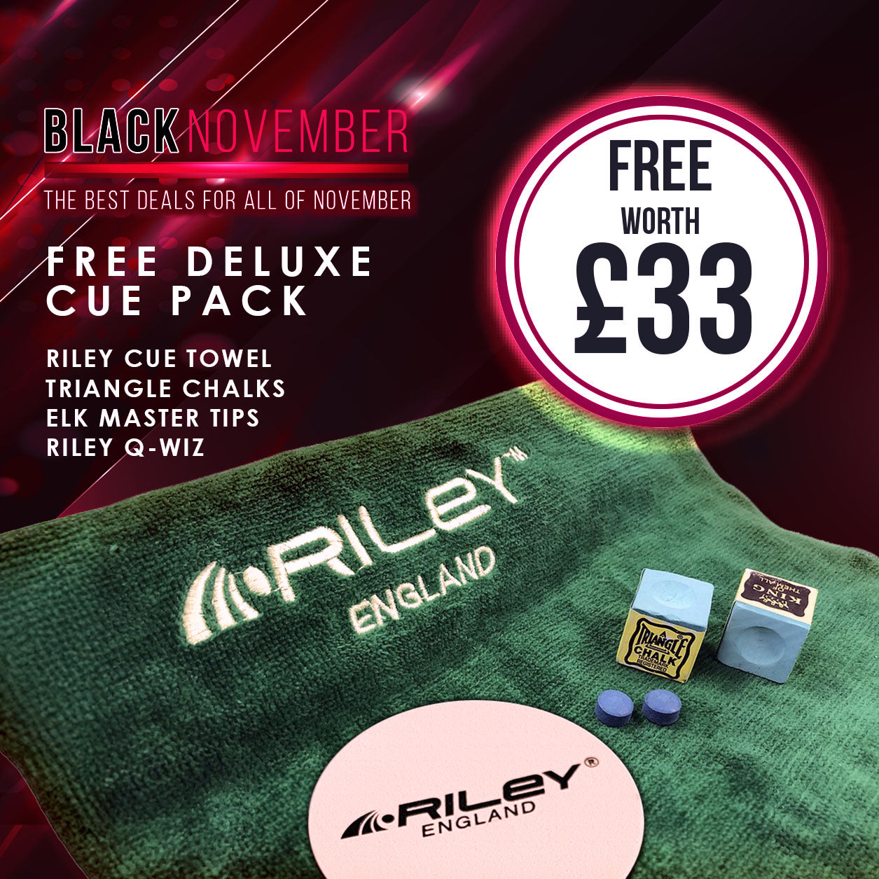 FREE ACCESSORY PACK including Elk master Tips; triangle chalk and Riley cue towel.