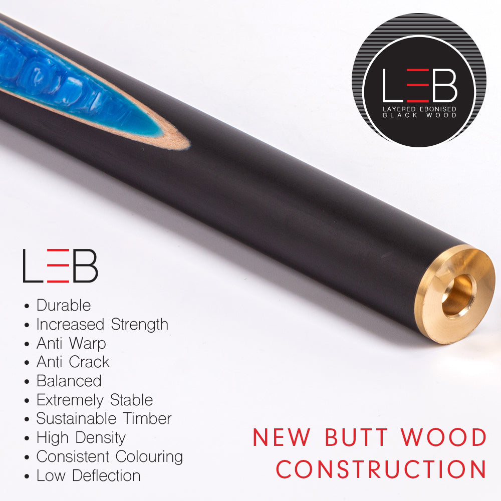 LAYERED EBONISED BLACK WOOD: A modern, high density and sustainable butt wood material advancement. Providing a durable and more consistent performance, whilst maintaining the traditional techniques and aesthetic qualities expected of a top level Pool and Snooker Cue.