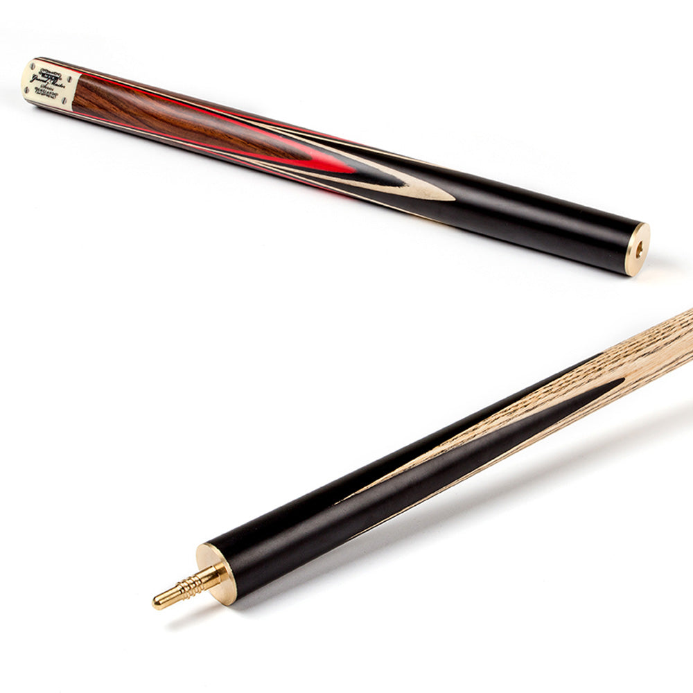 Grand Master - Layered Ebonised Black Wood is hand spliced on to the ash shaft. giving the instantly recognisable rounded finish to the four points. The butt is stained, not painted, to give a truly traditional, high quality appearance. On this cue, the veneers are all round - meaning that the design extends completely around the butt section. There are no decals on this cue - the veneers are genuine, and the splicing is exotic wood.