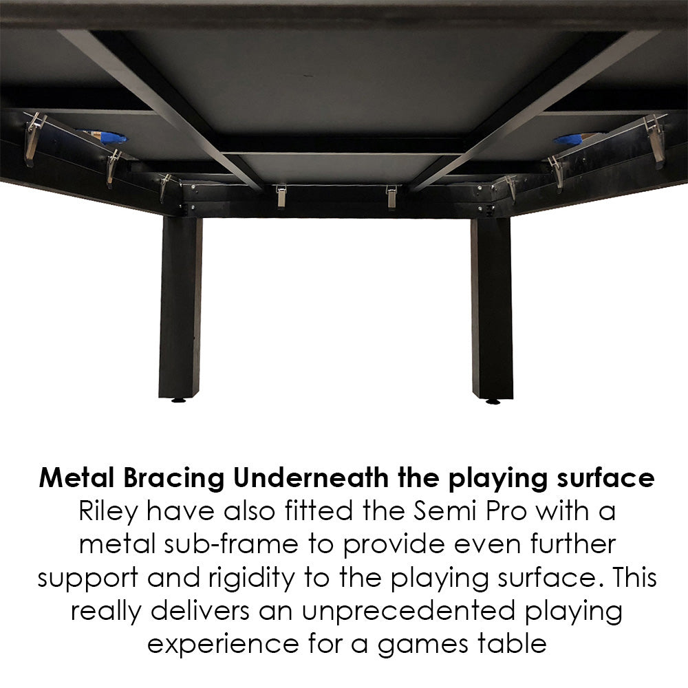 The table is fitted with competition quality K66 rubber cushions to provide maximum response during play. And, what’s more, unlike most games tables, the cloth and cushions on the Riley Semi Pro can be replaced once they are worn out – this extends the life of the table beyond that of any competing games table at this level.