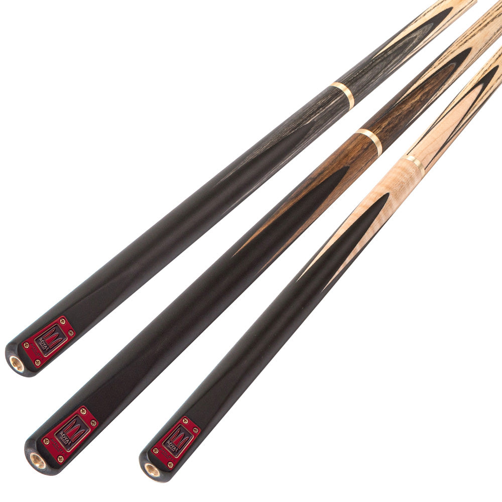 The cues are constructed of an Laminated Ebonised Black Wood butt section, hand spliced exotic wood inlays, top grade North American Ash and topped off with our new Riley Pro Tip.